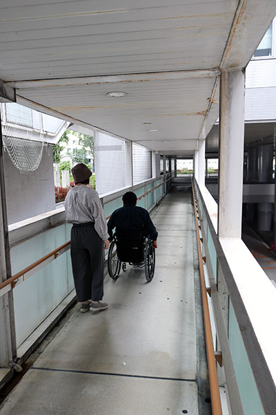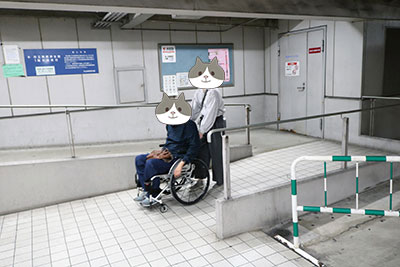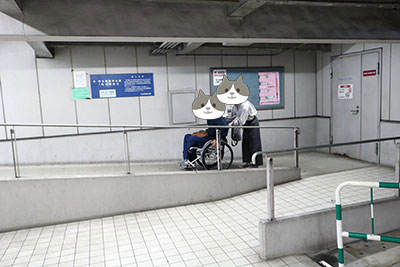 エレベーターを降りるとすぐに連絡用通路のスロープがあります。