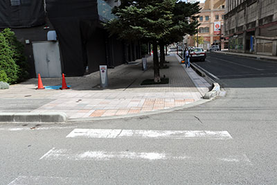 済生館を出て七日町に向かう横断歩道です。段差がなくスムーズに移動できます。